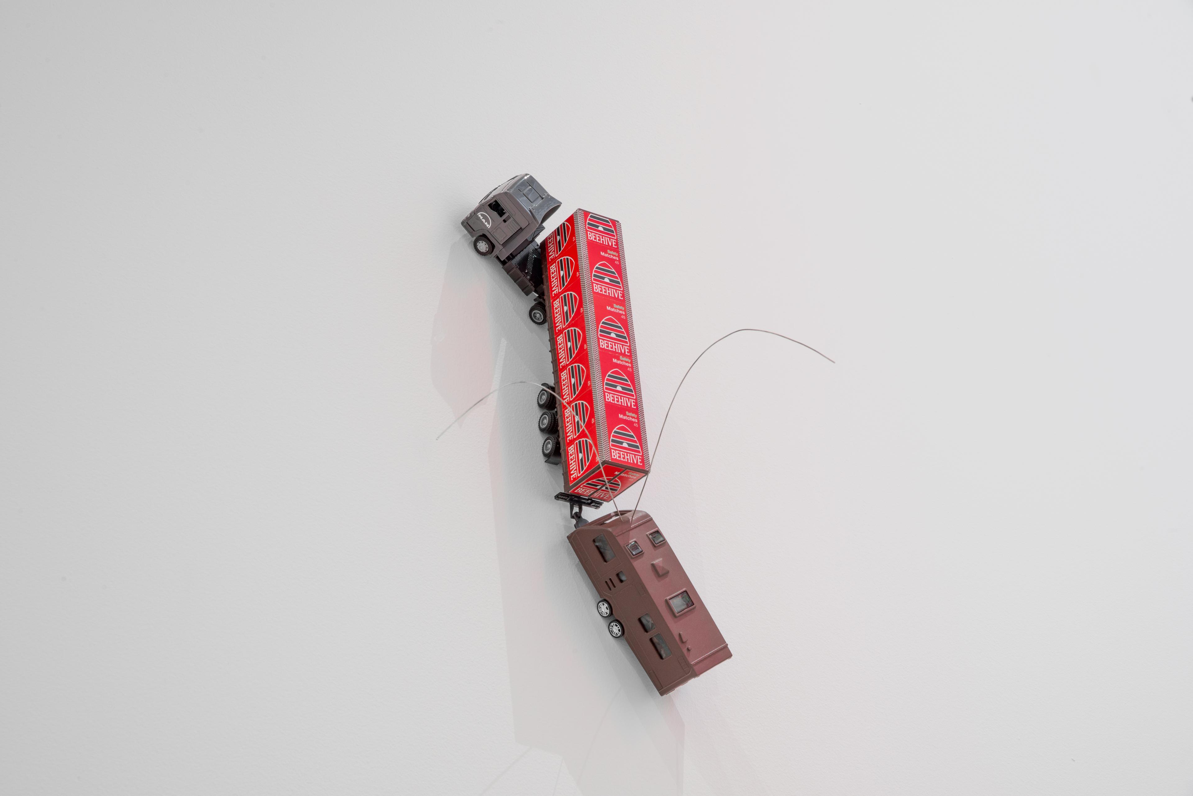 Yllwbro, Tipi Haere: Miss Wētā’s All-Terrain Caravan & Mobile Home, 2017, ‘MAN Road Hauler’ toy articulated truck and caravan, die cast metal, plastic, automotive spray paint, ‘Beehive’ matchbox labels, leaf litter, striker, copper wire, Ngā Puhipuhi o Te Herenga Waka—Victoria University of Wellington, gift of the artists and Mokopōpaki.